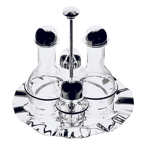 Cruet & Salt Cellar Set, 5-piece, includes: (2) 7-1/2 oz. glass cruets & (2) 2-1/2 oz. glass cellars, 8-1/4"H and (1) 18/10 stainless steel caddy, dishwasher safe, Sole