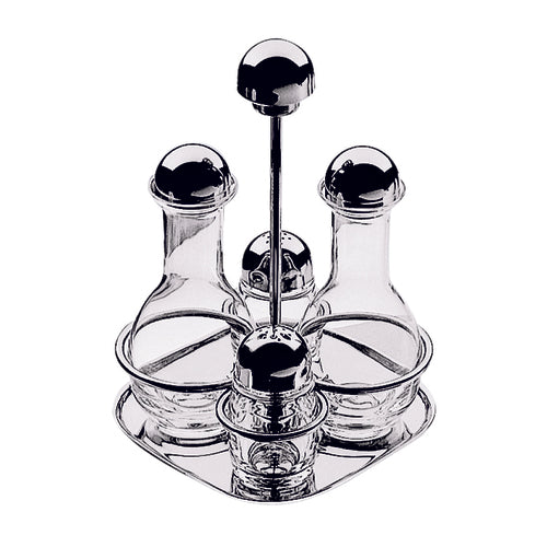 Cruet & Salt Cellar Set, 5-piece, includes: (2) 7-1/2 oz. glass cruets & (2) 2-1/2 oz. glass cellars, 8-5/8"H and (1) 18/10 stainless steel caddy, dishwasher safe, Gala