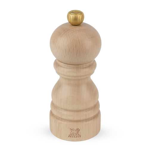 Paris Pepper Mill, 4-3/4" (12 cm), helix shaped double row of teeth mechanism first cracks then grinds pepper corns, patented treatment protects steel mechanism from corrosion, adjustable from coarse to fine grinds with a turn of the knob, PEFC-certified beech wood, natural (limited lifetime warranty on mechanism, contact factory for details)