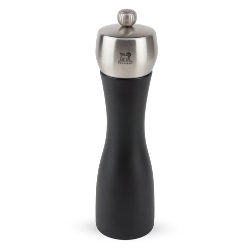 Fidji Pepper Mill, 8" (20 cm), helix-shaped double row of teeth mechanism, patented treatment protects steel mechanism from corrosion, adjustable from coarse to fine grinds, beech wood & stainless steel, black, matte finish (limited lifetime warranty on mechanism, contact factory for details)