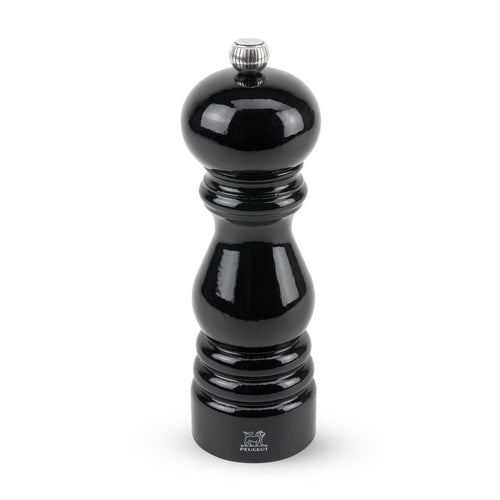 Paris Pepper Mill, 7" (18 cm), helix-shaped double row of teeth mechanism first cracks then grinds peppercorns, patented treatment protects steel mechanism from corrosion, adjustable from coarse to fine grinds with a turn of the knob, comes filled wit peppercorns from Vietnam, PEFC-certified beech wood, black lacquer (made in France) (limited lifetime warranty on mechanism, contact factory for details)