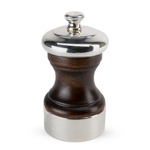 Palace Pepper Mill, 4" (10 cm), helix-shaped double row of teeth mechanism first cracks then grinds, patented treatment protects steel mechanism from corrosion, adjustable from coarse to fine grinds with a turn of the knob, comes filled with peppercorns, polished wood/silver plated (made in France) (limited lifetime warranty on mechanism, contact factory for details)