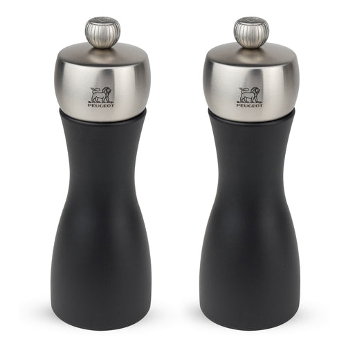 Fidji Pepper & Salt Mill Duo, 6" (15 cm), helix-shaped double row of teeth mechanism for pepper mill, stainless steel grinding mechanism for salt mill, comes filled with peppercorns, beech wood & stainless steel, black, matte finish (made in France) (limited lifetime warranty on mechanism, contact factory for details)