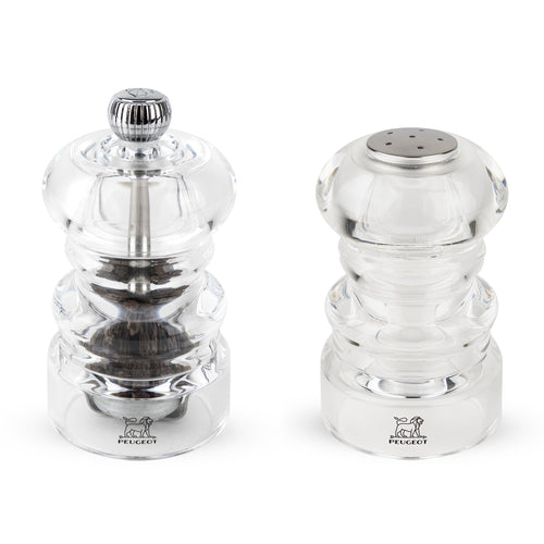 Nancy Pepper Mill & Salt Shaker Duo, 1 oz., 3-1/2" (9cm), helix-shaped double row of teeth mechanism for pepper, adjustable with a turn of the knob, hand wash, acrylic, clear (made in France) (lifetime warranty on mechanism, contact factory for details)
