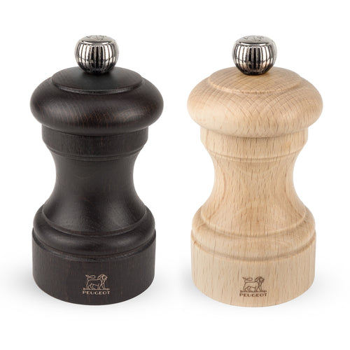 Bistro Pepper Mill, 4" (10 cm), helix-shaped double row of teeth mechanism, patented treatment protects steel mechanism from corrosion, adjustable from coarse to fine grinds, comes filled with peppercorns, PEFC-certified beech wood, chocolate (made in France) (limited lifetime warranty on mechanism, contact factory for details)