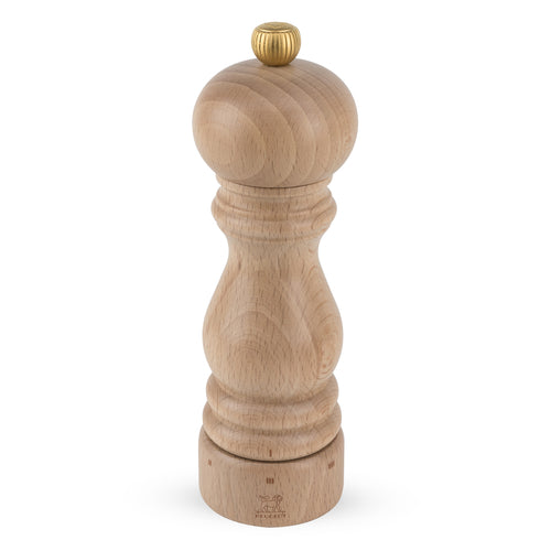 Paris Salt Mill, 7" (18 cm), with u'Select patented grind control system, helix-shaped double row of teeth mechanism, patented treatment protects steel mechanism from corrosion, (6) pre-defined levels of grinds, comes filled, PEFC-certified beech wood, natural (made in France) (limited lifetime warranty on mechanism, contact factory for details)