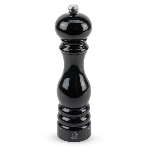 Paris Salt Mill, 8-3/4" (22 cm), with u'Select patented grind control system, helix-shaped double row of teeth mechanism, patented treatment protects steel mechanism from corrosion, (6) pre-defined levels of grinds, comes filled, PEFC-certified beech wood, black lacquer (made in France) (limited lifetime warranty on mechanism, contact factory for details)