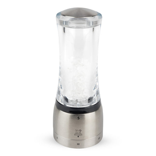 Daman Salt Mill, 6-1/4" (16 cm), with u'Select patented grind control system, helix-shaped double row of teeth mechanism, patented treatment protects steel mechanism from corrosion, (6) pre-defined levels of grinds, acrylic & stainless steel (made in France) (limited lifetime warranty on mechanism, contact factory for details)