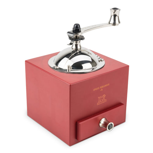 Moulin D'Olivier Roellinger Pepper Mill, 5" (13cm), burr grinder, crank handle, helix-shaped double row of teeth mechanism, patented treatment protects steel mechanism from corrosion, can be adjusted from coarse to fine grinds, use with or without tray, box shaped, beech wood & stainless steel, red, matte finish (made in France) (limited lifetime warranty on mechanism, contact factory for details)