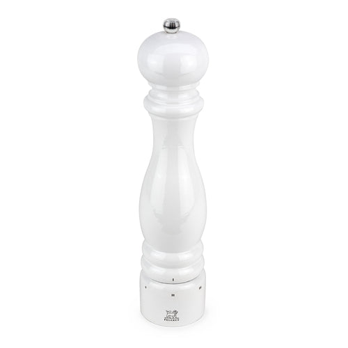 Paris Salt Mill, 12" (30 cm), with u'Select patented grind control system, helix-shaped double row of teeth mechanism, patented treatment protects steel mechanism from corrosion, (6) pre-defined levels of grinds, comes filled, PEFC-certified beech wood, lacquer white (made in France) (limited lifetime warranty on mechanism, contact factory for details)