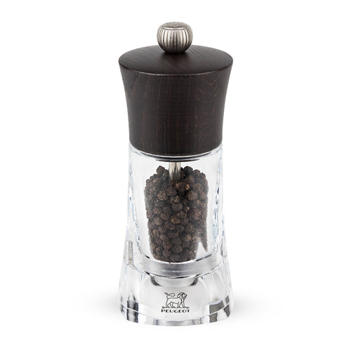 Oleron Pepper Mill, 5-1/2" (14 cm), curved twist design, 2-stage steel grinding mechanism, patented treatment protects steel mechanism from corrosion, comes filled, PEFC-certified beech wood & acrylic, chocolate (made in France) (limited lifetime warranty on mechanism, contact factory for details)