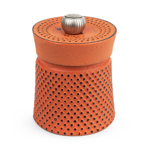 Bali Pepper Mill, 3" (8 cm), helix-shaped double row of teeth mechanism, patented treatment protects steel mechanism from corrosion, adjustable from coarse to fine grinds, comes filled with peppercorns, Asian inspired shape, cast iron, orange (made in France) (limited lifetime warranty on mechanism, contact factory for details)