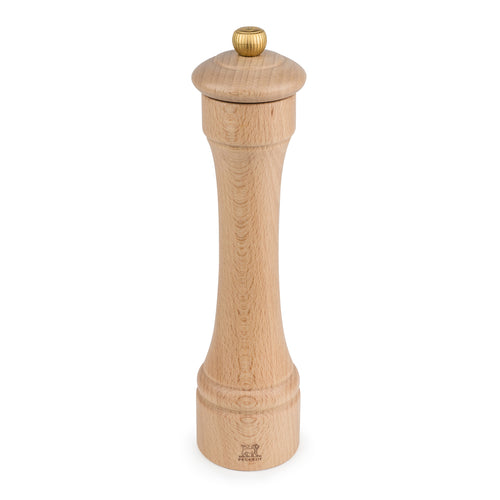 Hostellerie Pepper Mill, 8-3/4" (22 cm), helix-shaped double row of teeth mechanism, patented treatment protects steel mechanism from corrosion, adjustable from coarse to fine grinds, comes filled with peppercorns, PEFC-certified beech wood from France, natural (limited lifetime warranty on mechanism, contact factory for details)