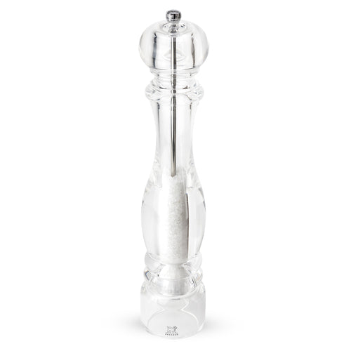 Nancy Salt Mill, 15" (38 cm), helix-shaped double row of teeth mechanism, patented treatment protects steel mechanism from corrosion, adjustable from coarse to fine grinds, comes filled with salt rocks, acrylic, clear (made in France) (limited lifetime warranty on mechanism, contact factory for details)