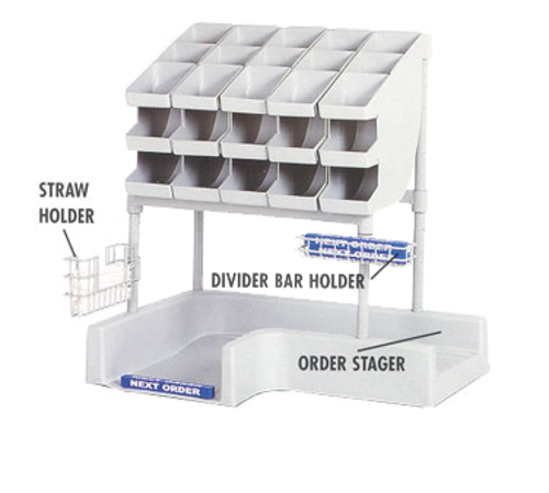ISS Condiment Tower, with (5) 3-tier bins and straw holder, right handed operation, metal posts with grey epoxy coating, molded plastic bins, NSF