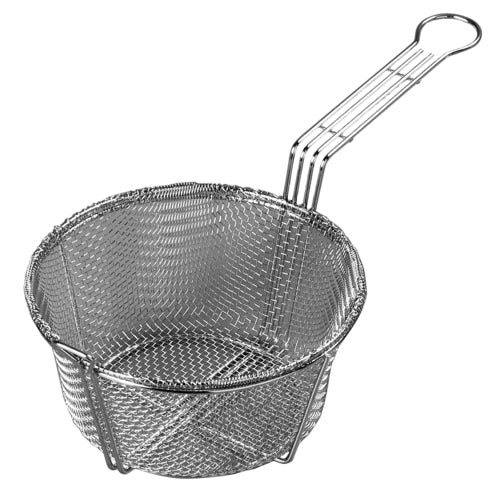 Mesh Fryer Basket, 8-3/4" dia., round, 7-1/2"L handle, front drain hook, dishwasher safe, chrome-plated nickel steel