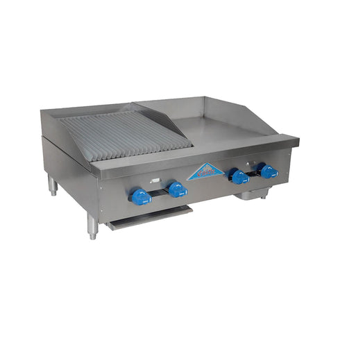 Char-Broiler/Griddle Combination, countertop, gas, 36" wide x 32" deep frame, (1) 18" x 24" broiler area, cast iron grates, sloped or flat, iron radiants, (1) 18" x 24" x 1" thick griddle plate, stainless steel splash guards on 3 sides, stainless steel exterior, 4" stainless steel legs, (4) manual controls, 76,000 BTU , NSF