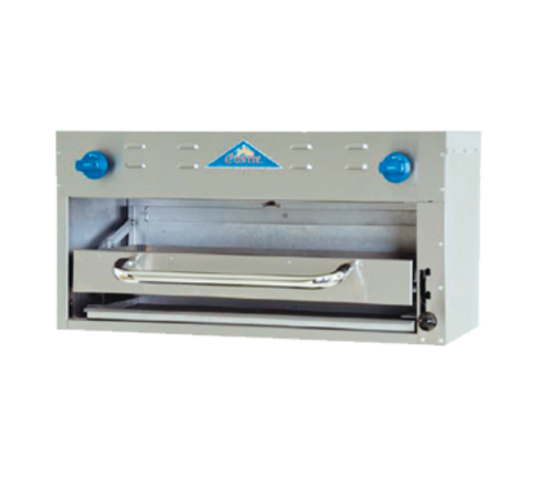 Salamander, gas 36" wide frame, 28" wide x 13" deep broiler rack on roll out tray, 3 locking positions, (2) separate infra-red burners, spillage pan, stainless steel finish, 36,000 BTU, NSF