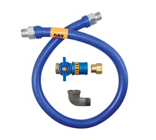 Dormont Blue Hose™ Moveable Gas Connector Hose Assembly, 1" inside dia., 60" long, covered with stainless steel braid, coated with blue antimicrobial PVC, 1 Safety Quik® QDV, 1 elbow, 294,000 BTU/hr minimum flow capacity, limited lifetime warranty
