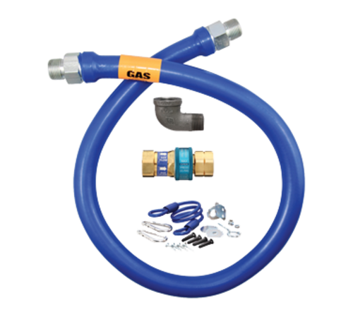 Dormont Blue Hose™ Moveable Gas Connector, 1" inside dia., 36" long, covered with stainless braid, coated with blue antimicrobial PVC, (1) SnapFast® QD, (1) 90˚ street elbow, coiled restraining cable with hardware, packaged in a retail box, limited lifetime warranty