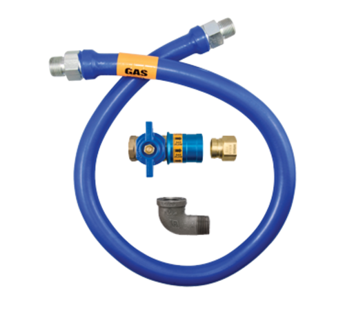 Dormont Blue Hose™ Moveable Gas Connector Hose Assembly, 1/2" inside dia., 60" long, covered with stainless steel braid, coated with blue antimicrobial PVC, 1 Safety Quik® QDV, 1 elbow, 60,000 BTU/hr minimum flow capacity, limited lifetime warranty