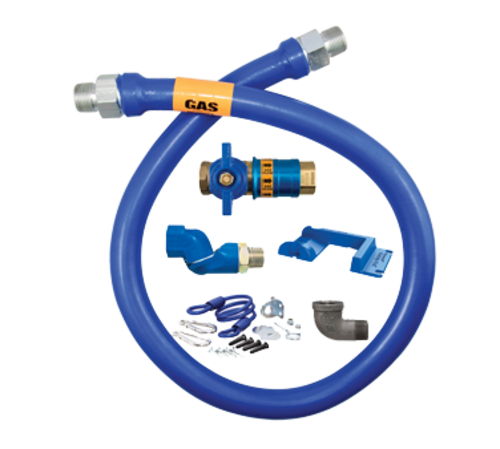 Dormont Blue Hose™ Moveable Gas Connector Kit, 1/2" inside dia., 48" long, covered with stainless steel braid, coated with blue antimicrobial PVC, (1) Safety Quik® QDV, (1) Swivel MAX®, (1) pair Safety Set® with hardware mounting options, coiled restraining cable with hardware, limited lifetime warranty