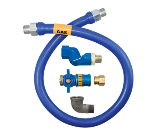 Dormont Blue Hose™ Moveable Gas Connector Hose Assembly, 3/4" inside dia., 60" long, covered with stainless steel braid, coated with blue antimicrobial PVC, 1 Safety Quik® QDV, 1 Swivel MAX®, 1 elbow, 147,000 BTU/hr minimum flow capacity, limited lifetime warranty