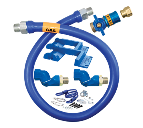 Dormont Blue Hose™ Moveable Gas Connector Kit, 3/4" inside dia., 48" long, covered with stainless steel braid, coated with blue antimicrobial PVC, (1) Safety Quik® QDV, (2) Swivel MAX®, (1) pair Safety Set® with hardware mounting options, coiled restraining cable with hardware, limited lifetime warranty