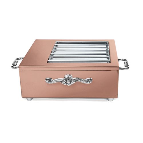 Butane Stove Cover-Up, fits most standard stoves, inside dimensions measure 10-1/2"L x 3-1/2"H x 13-3/4"W, custom sizes available, stainless steel with brass accents, XYLO copper finish with Anti-Microbial 24/7 germ-free surface coating (made to order, non-returnable)