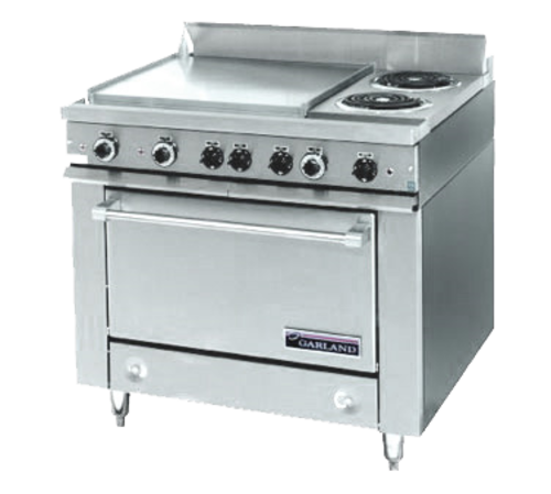 36E Series Heavy Duty Range, electric, 36", (4) boil sections, (3) heat switch controls, storage base, 3" high vent riser, stainless steel front, sides & front rail, 6" legs, 12.0kW, cCSAus, NSF (Garland)