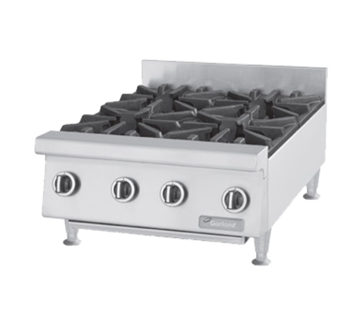 Hotplate, 24" W, countertop, gas, heavy-duty, (4) 30,000 BTU Starfire Pro open burners, manual controls, pilot lights, stainless steel front, sides and back, 3-1/2" front rail, 4" high adjustable legs, 120,000 BTU (Garland)