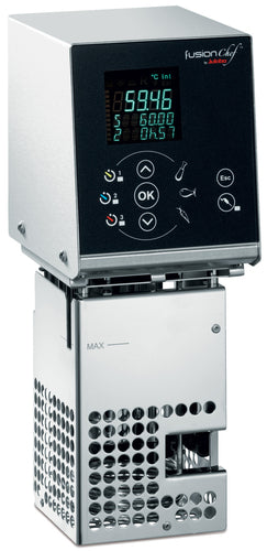 Fusion Chef Diamond Thermal Circulator, 5"L x 8"W x 13"H, 61 quarts capacity, includes (3) timers, 0.01°F (0.01°C) temperature stability, auto calibration, simultaneously displays: target temperature, actual temperature, core temperature, and timer, high capacity pump (3-3/4 gallons per minute), (1) protection grid, stainless steel, black, 2000 watts