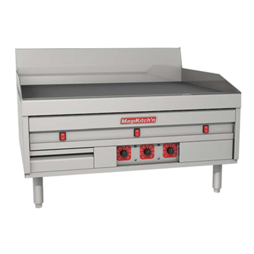 Griddle, electric, 60" counter top, 59-3/4" x 24" cooking surface, 1" thick heavy duty polished griddle plate, solid state thermostat, grease chute and box, front grease trough, 3" side splash, stainless steel, 4" removable legs, 28.5kW, ETL-Sanitation, cETLus, CE