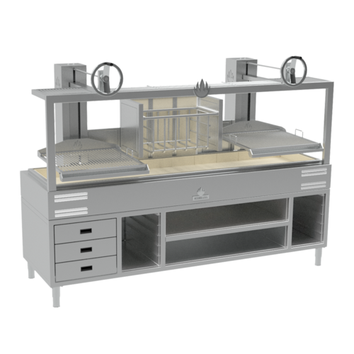 Charcoal Parrilla Grill, 99-1/5"W x 41-7/16"D x 73-1/4"H, (2) 15-3/5"W x 13-3/8"D & (1) 59-4/5"W x 13-3/8"D heating racks, (2) 27"W x 25"D vertical cooking racks, integral burning pit enclosed in stainless steel chassis, stainless steel thermal break with cooling louvers, front-mounted adjustment wheel, includes: (1) fire basket, (2) rod grills, ash shovel, ember poker, (2) tongs, (2) grill brushes & Ecofire firelighters, stainless steel stand complete with (3) drawers & (2) gastronorm racks, stainless steel, CE, cULus, UL EPH Classified (Initial charcoal load - 50 lbs., requires approximately 30 minutes preheat time and typically lasts 7 hours)