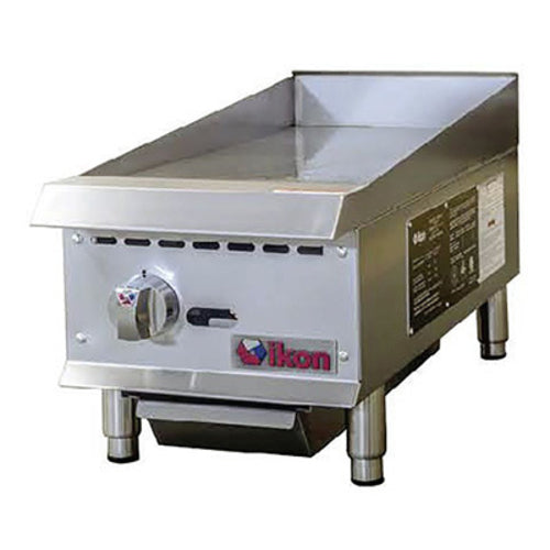 IKON Griddle, gas, countertop, 12" W x 34.4" D, adjustable manual control, front lit pilot light, (1) 30,000 BTU U-shape burners, 3/4" polished steel griddle plate, (1) gas control knobs, double wall insulated sides, welded back & side splash guards, rear flue, removable 3-1/4" grease drawer with weep hole & baffle, 4" wide grease trough, stainless steel cabinet, stainless steel adjustable legs, non-skid feet, 30,000 BTU total, CSA-Sanitation, CSA Star, CSA Flame