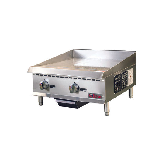 IKON Griddle, gas, countertop, 24" W x 34.4" D, adjustable manual control, front lit pilot light, (2) 30,000 BTU U-shape burners, 3/4" polished steel griddle plate, (2) gas control knobs, double wall insulated sides, welded back & side splash guards, rear flue, removable 3-1/4" grease drawer with weep hole & baffle, 4" wide grease trough, stainless steel cabinet, stainless steel adjustable legs, non-skid feet, 60,000 BTU total, CSA-Sanitation, CSA Star, CSA Flame