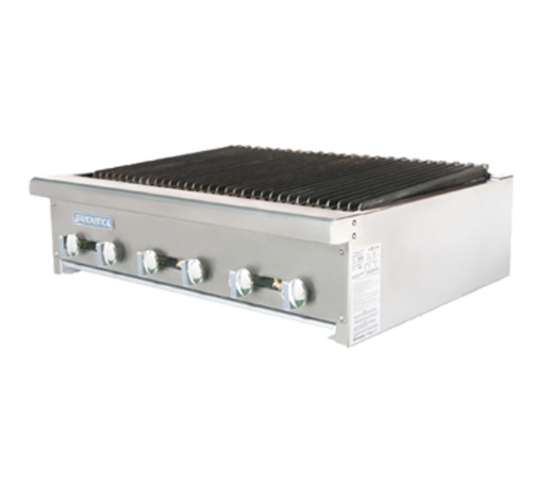 Radiance Charbroiler, countertop, gas, 36" wide, 16 ga. stainless steel front plate & wrap, heavy duty cast iron radiant & grates (6) burners with manual controls, removable grease pan, bullnose stainless steel front extension, heat resistant on-off knob, 2" stainless steel standard legs, regulator included, total 90,000 BTU, CSA, CSA-Sanitation
