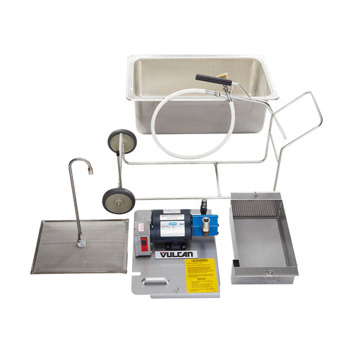 Portable Fryer Filtration, 110 lb. oil capacity, 8 gallon/minute pump motor, 4' high temperature discard hose, stainless steel mesh filter screen assembly, no paper required (can be used with any manufacturers brand of free standing fryers), 6" casters, 1/3 HP motor/pump