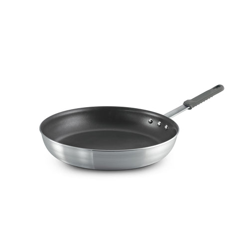 Professional Restaurant Fry Pan, 14" dia., riveted handle, grey soft-grip silicone handle, oven safe up to 400°F, compatible with gas, electric, and ceramic glass cooktops, dishwasher safe, non stick coated, 3.6mm heavy gauge aluminum alloy, starburst satin finish, PFOA free, NSF, Made in Brazil (2 each per case)