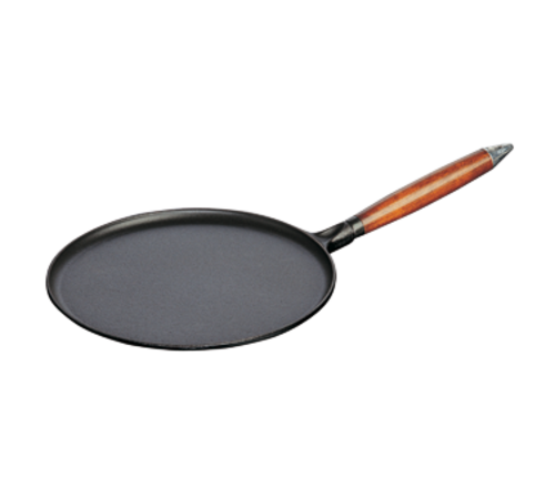 Staub® Crepe Pan, 11" dia. (18.9" x 10.1" x 2.4" O.A.), with spreader and spatula, enameled cast iron, safe for all heat sources including induction, wooden handle, black matte (Special Promo NET Price) (contact factory for price)