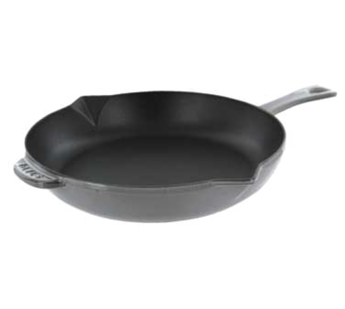 Staub® Fry Pan, 10", (19" x 10.4" x 2" O.A.), with pour spout, dishwasher safe, oven safe up to 572°F, safe for most heat sources including induction, enameled cast iron, graphite grey (contact factory for price)