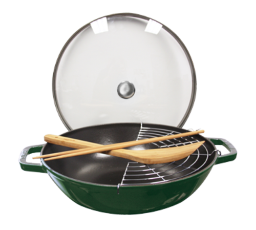 Staub® Perfect Pan, 4.5 qt., 15.2" x 11.8" x 4.7" O.A., round, with glass lid and half-moon shaped stainless steel rack, dishwasher safe, oven safe up to 572°F, safe for most heat sources including induction, enameled cast iron, basil (contact factory for price)