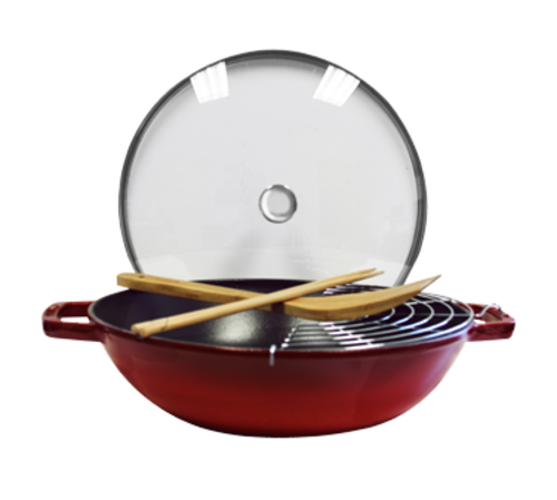 Staub® Perfect Pan, 4.5 qt., 15.2" x 11.8" x 4.7" O.A., round, with glass lid and half-moon shaped stainless steel rack, dishwasher safe, oven safe up to 572°F, safe for most heat sources including induction, enameled cast iron, grenadine (contact factory for price)