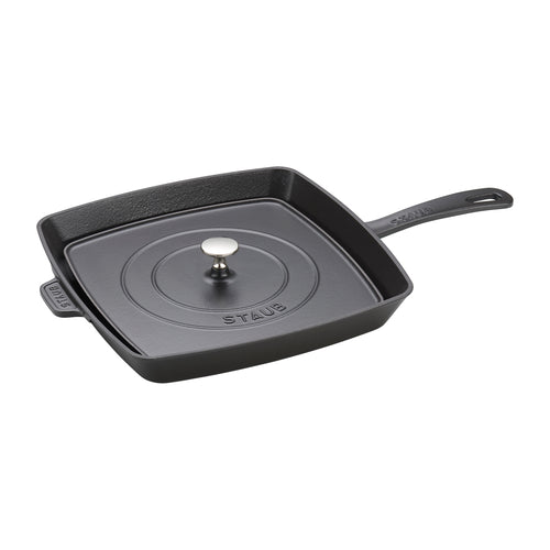 Staub® Grill & Press Set, 12" x 12", (20.3" x 11.8" x 1.9" O.A.), square, with 10-3/10" square press, dishwasher safe, oven safe up to 572°F, safe for most heat sources including induction, enameled cast iron, matte black (contact factory for price)