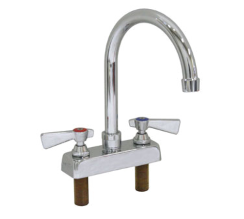 Faucet, 4" deck mounted backsplash, with 5" gooseneck spout, 1/2" NPT male inlets, color coded Red & Blue handles, no lead, MAX 2.2GPM @ 60PSI