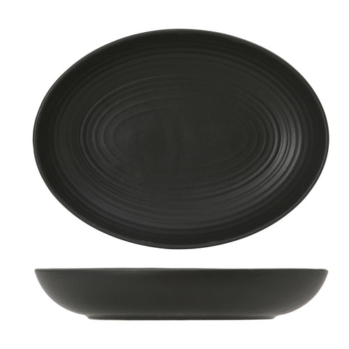 Bowl, 35 oz., 10-3/4" x 8" x 1-7/8"H, oval, embossed, microwave & dishwasher safe, oven proof, fully vitrified, lead-free, porcelain, TuxTrendz®©, Zion, matte black