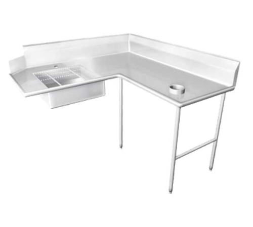 Dishtable, soiled, with pre-rinse sink, corner, right-to-left, 72" machine to corner, 120" corner to end, 16 gauge stainless steel top with 16 gauge stainless steel channeling, 8"H backsplash & stainless steel legs & gussets