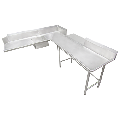 Dishtable, soiled, with pre-rinse sink, corner, right-to-left, 72" machine to corner, 48" corner to end, 16 gauge stainless steel top with 16 gauge stainless steel channeling, 8"H backsplash & stainless steel legs & gussets
