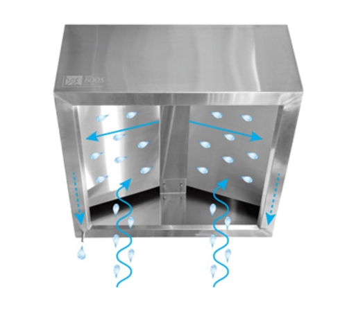 Condensate Hood, ventless box type, 42"W x 42"D x 25"H, full perimeter gutter with drain, removable condensate baffle, 3/8" dia. x 2" rear drain tube, welded hanging brackets, 18/300 series stainless steel construction, NSF (Available in Effingham)