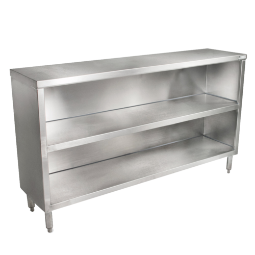 Dish Cabinet, open front, 72"W x 18"D x 35"H overall size, open base with mid-shelf, Stallion Safety Edge front, 18/300 stainless steel construction, stainless steel legs with adjustable bullet feet, NSF (Available in Effingham and Nevada)